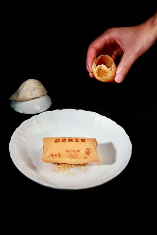 金湯燕窩春卷配香醋,改良傳統(tǒng)春卷技法,以燕之屋清潤(rùn)燕窩為餡,保證入口酥脆的同時(shí),更添輕盈、爽滑口感,搭配香醋的微酸回甘,呈現(xiàn)豐富味覺層次。以魯菜“炸”技見長(zhǎng)的外酥里嫩為靈感,王浩全將其改良為更輕盈的“空氣春卷”,酸、鮮、酥、潤(rùn)交織成舌尖上的藝術(shù),打破傳統(tǒng)春卷的形態(tài)束縛。