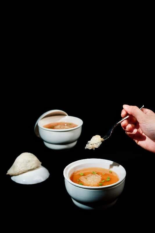 芙蓉糟溜燕菜,升級(jí)傳統(tǒng)“糟溜”手法,同時(shí)融入西式元素,彈潤(rùn)透亮燕窩浸染陳年酒糟的馥郁,與潔白蛋清碰撞出形式芙蓉的絕妙色彩,入口酒香沁脾,燕絲纏綿,帶來別具一格的舌尖體驗(yàn)。酒糟氣息悠悠升騰,融合在一匙間完成,既保留了“酒香入菜”的傳統(tǒng)精髓,也表達(dá)了現(xiàn)代美學(xué)語境下的“輕盈與克制”。